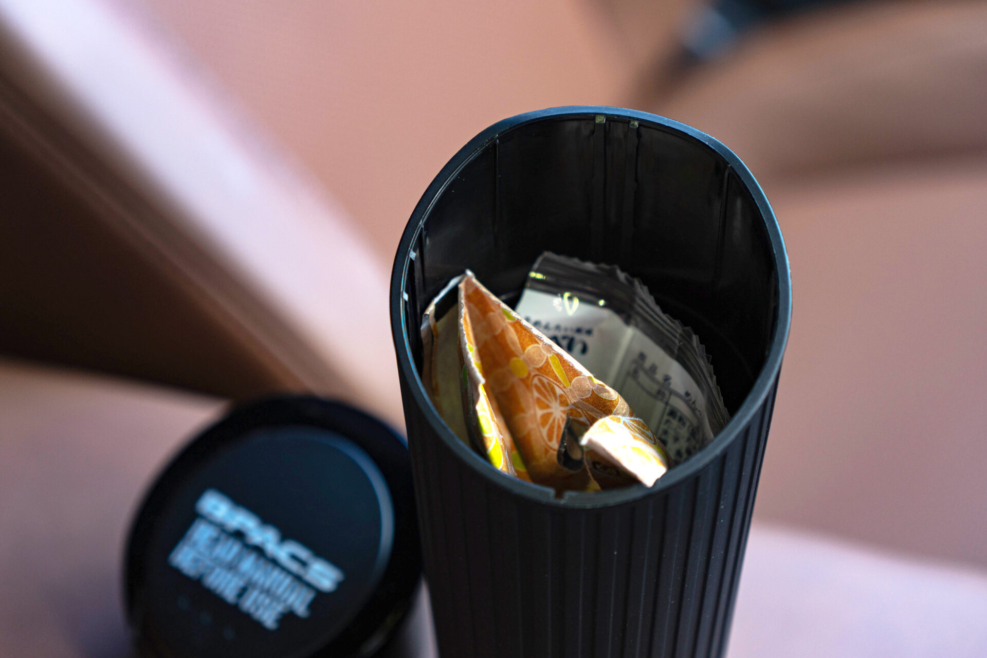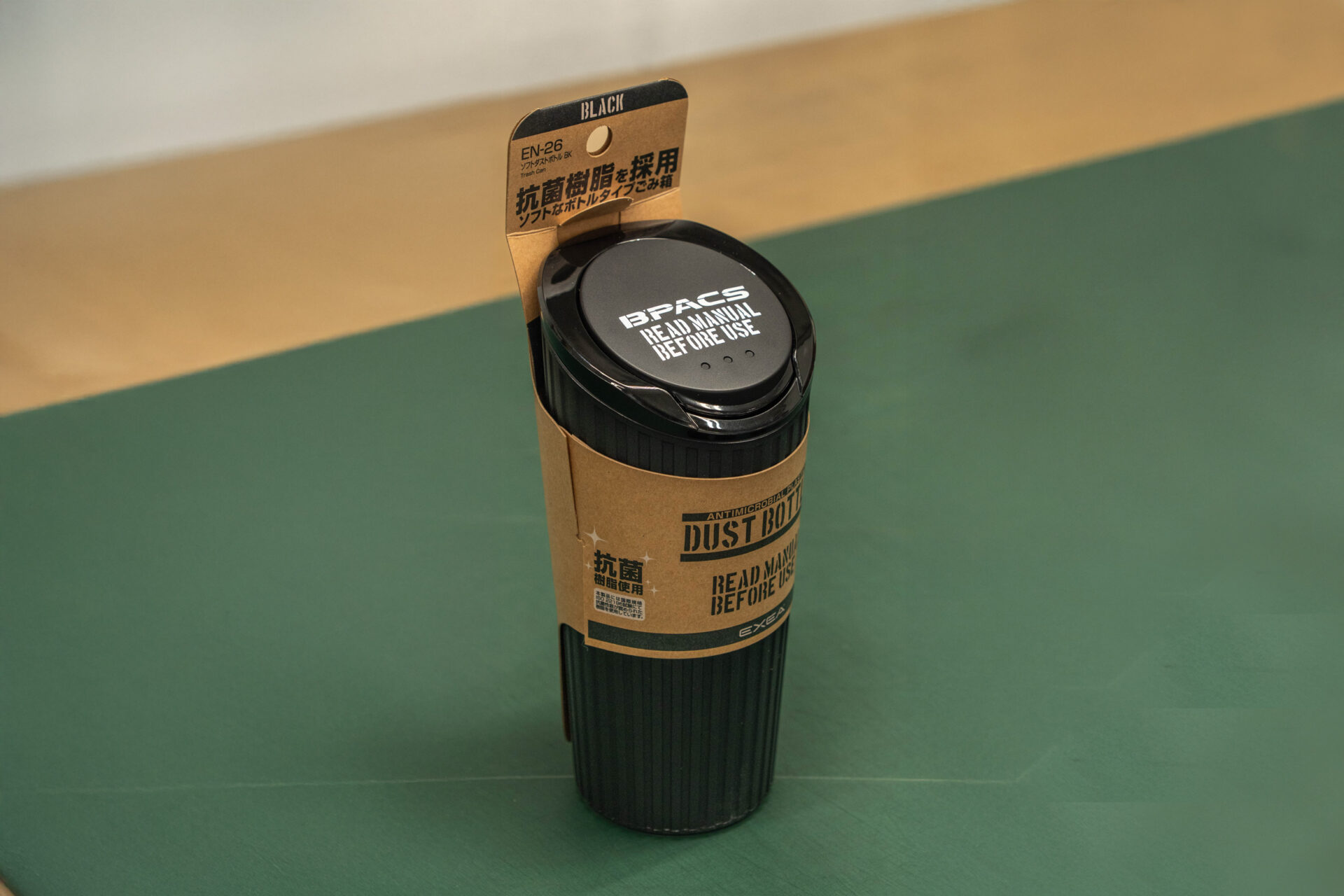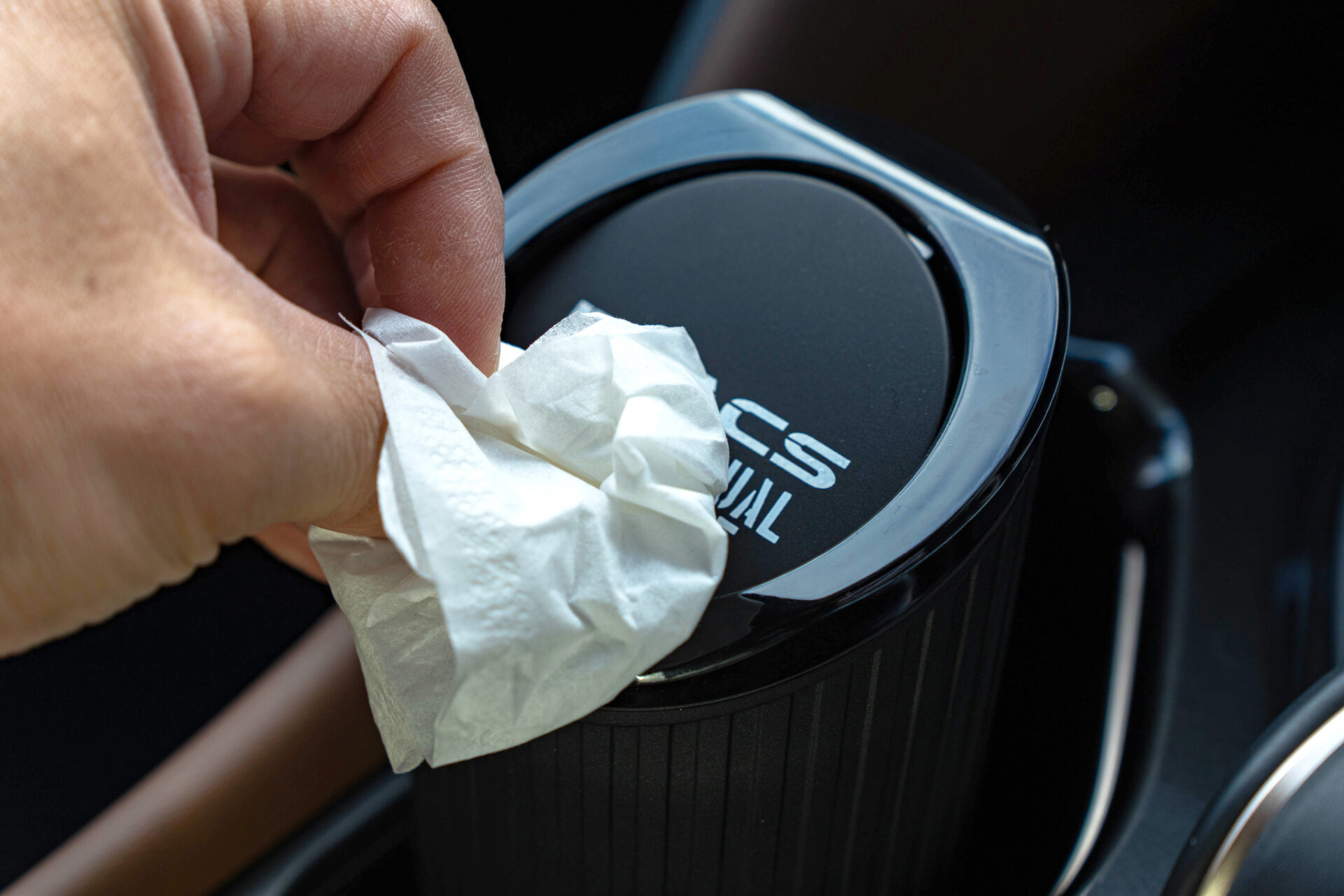 ドリンクホルダーに収まる、”ちょっとしたゴミ”を捨てるに最適なダストボックス。