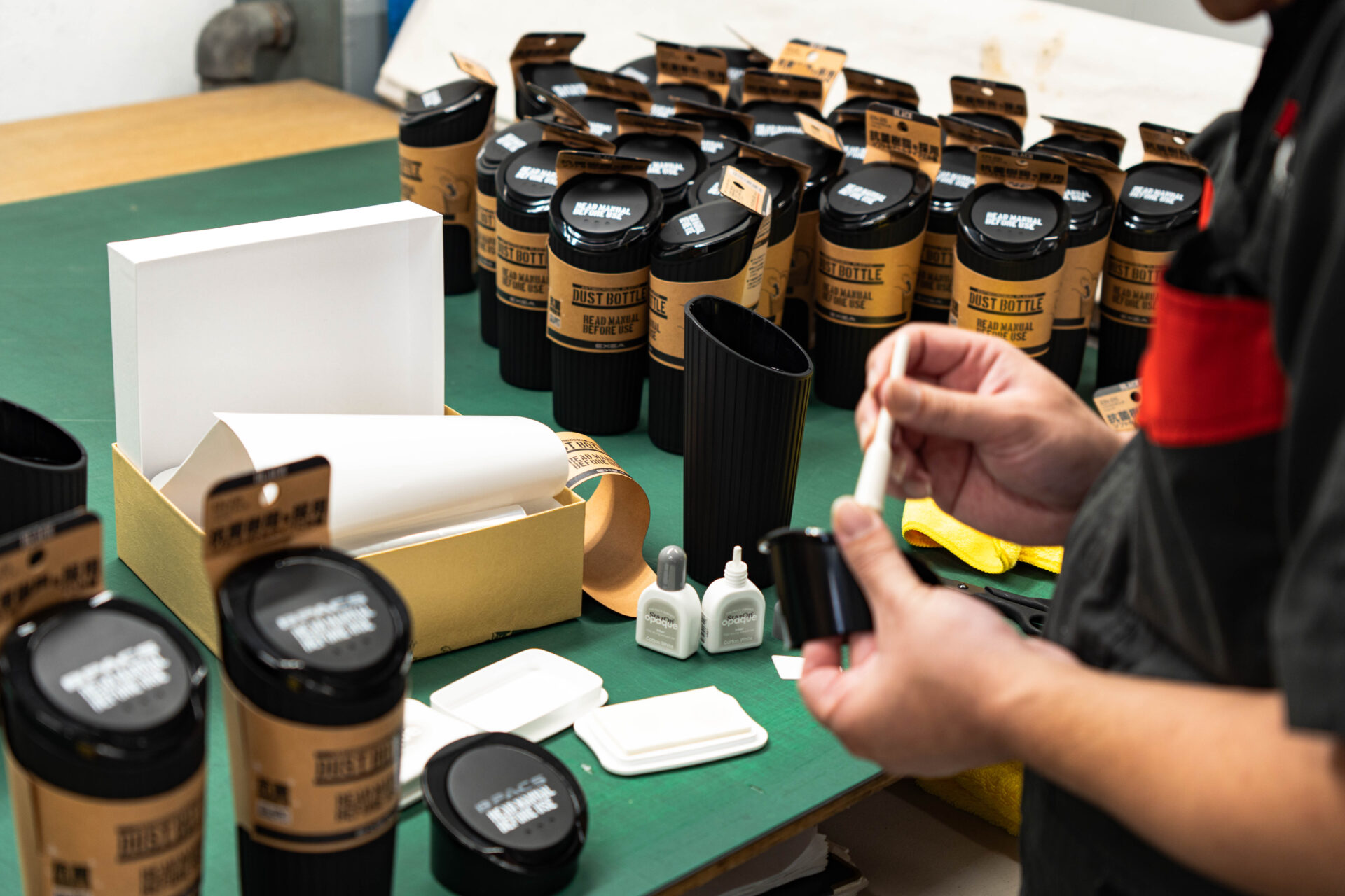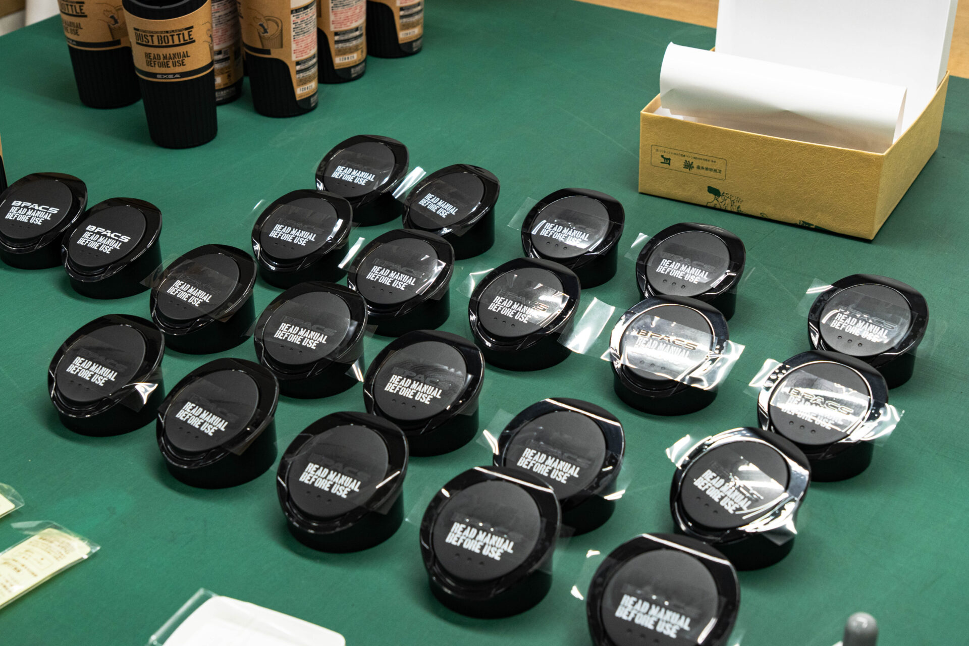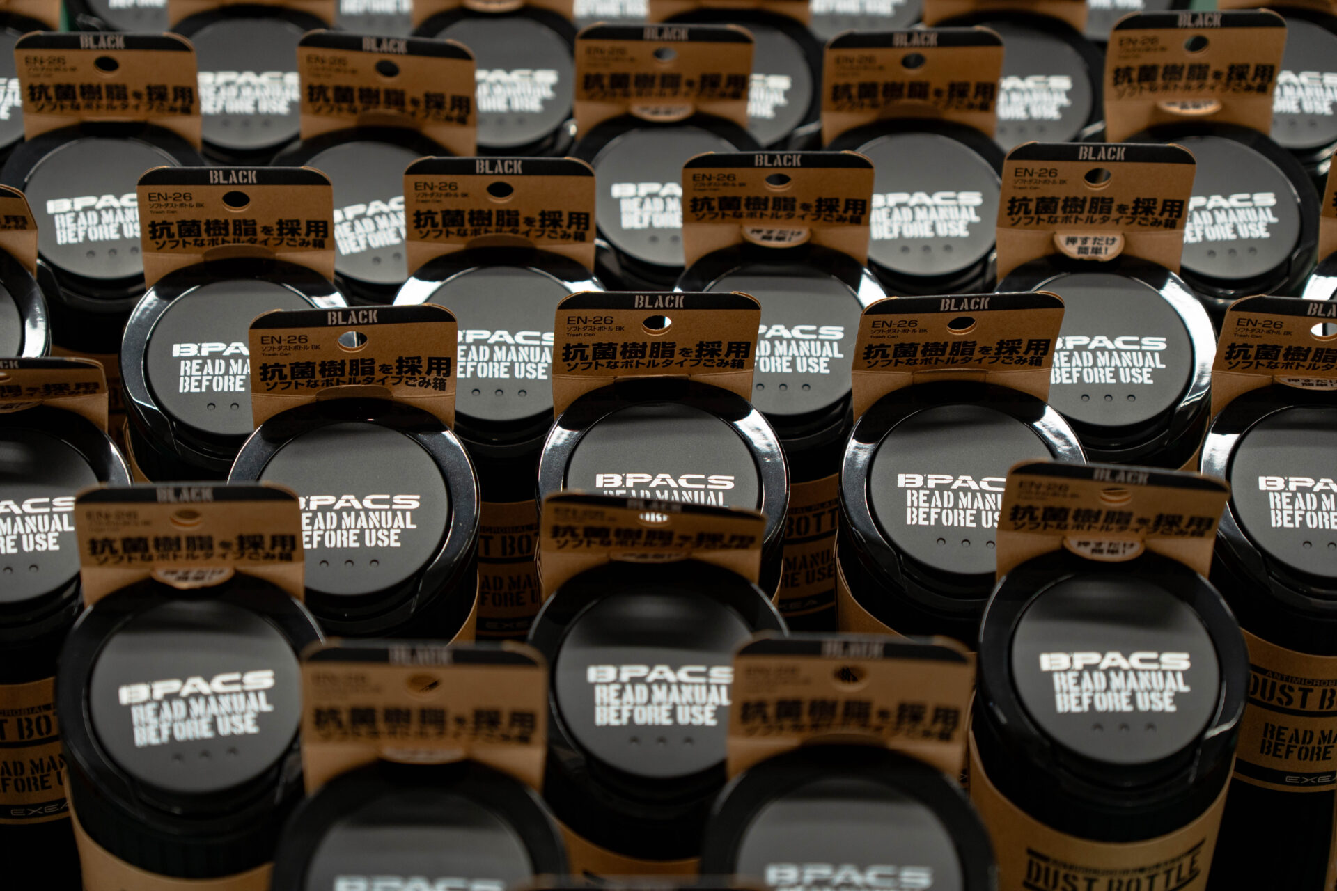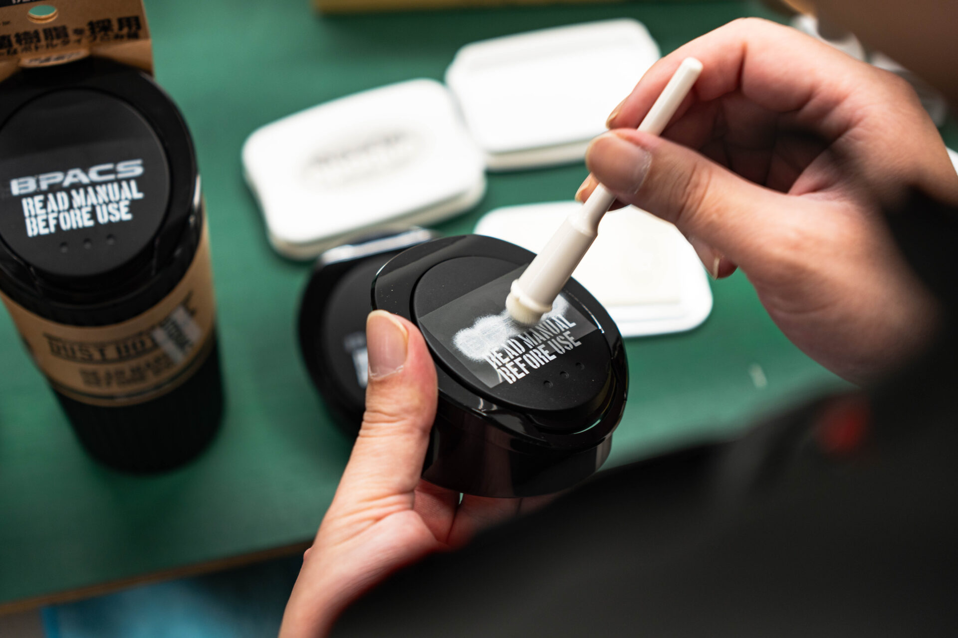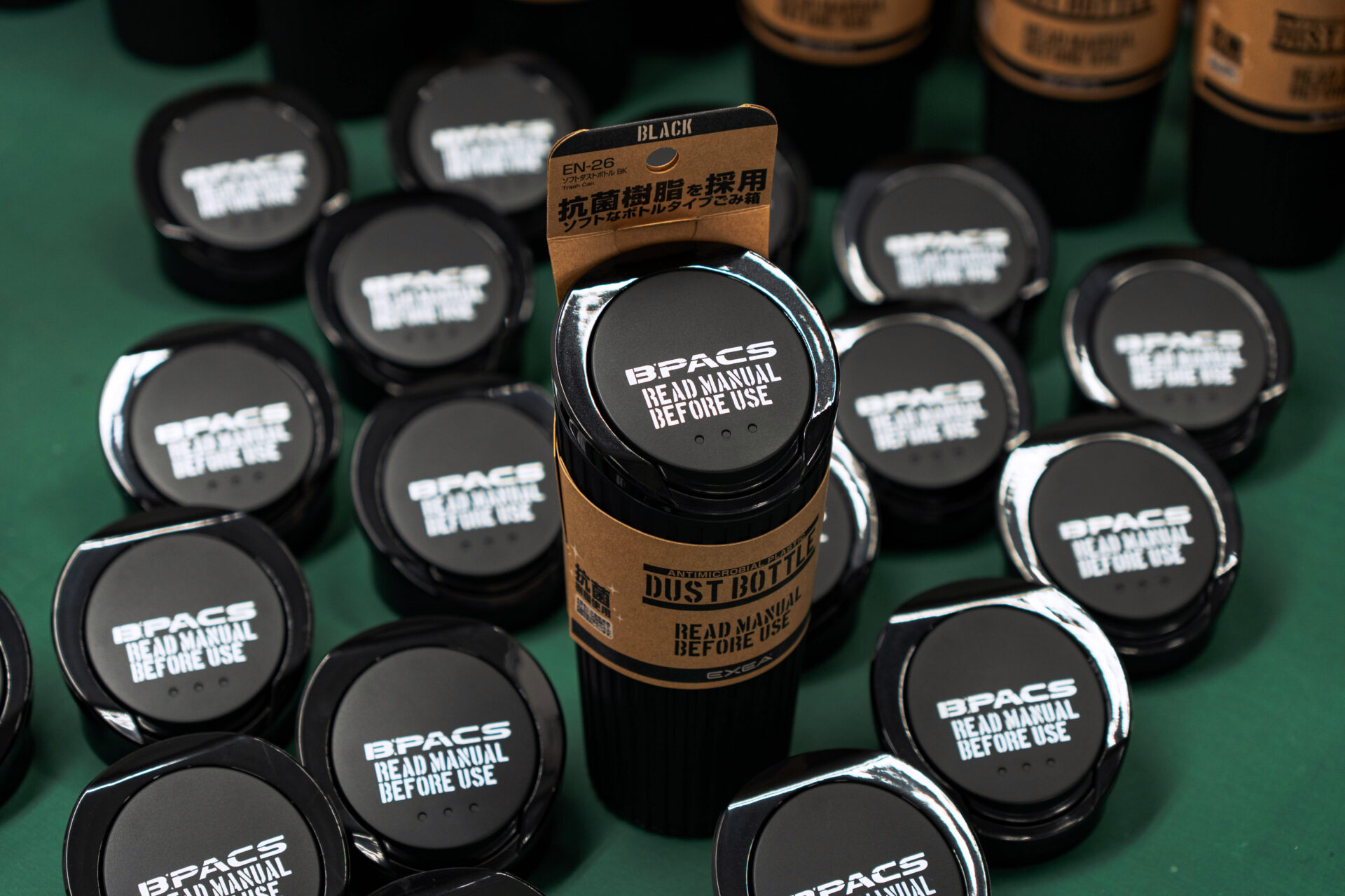 元のステンシルデザインに沿ったシンプルなデザインを継承しています。B-PACSのロゴはスタッフが1つ1つ手作りしたステンシル印字をしています。