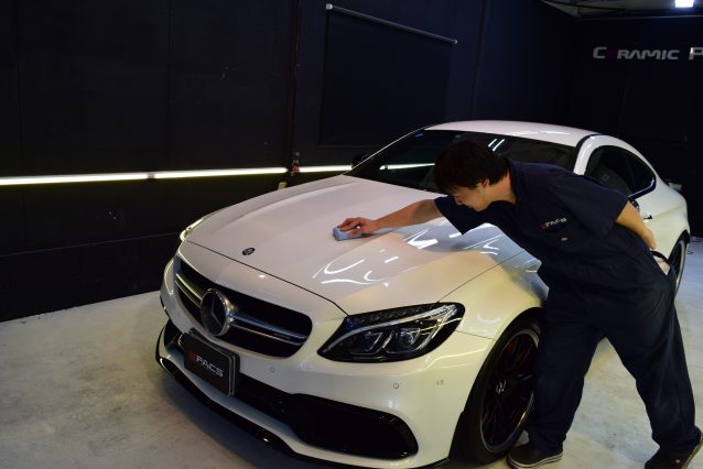 今回施工するC63クーペは経年車の為、塗装を深く削る研磨作業を施工過程でおこないますが、深く削ると塗装の密度は荒くなりコーティングを塗り込んでも2割3割は塗装の中に染み込んでしまいます。