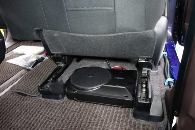 大口径スピーカーが構造上無加工で取付できませんので、取付けるならドアを加工してアウターバッフルとかになりますが、今回はリーズナブル&確実なサブウーファーを取付けで弱点を潰していきたいと思います。