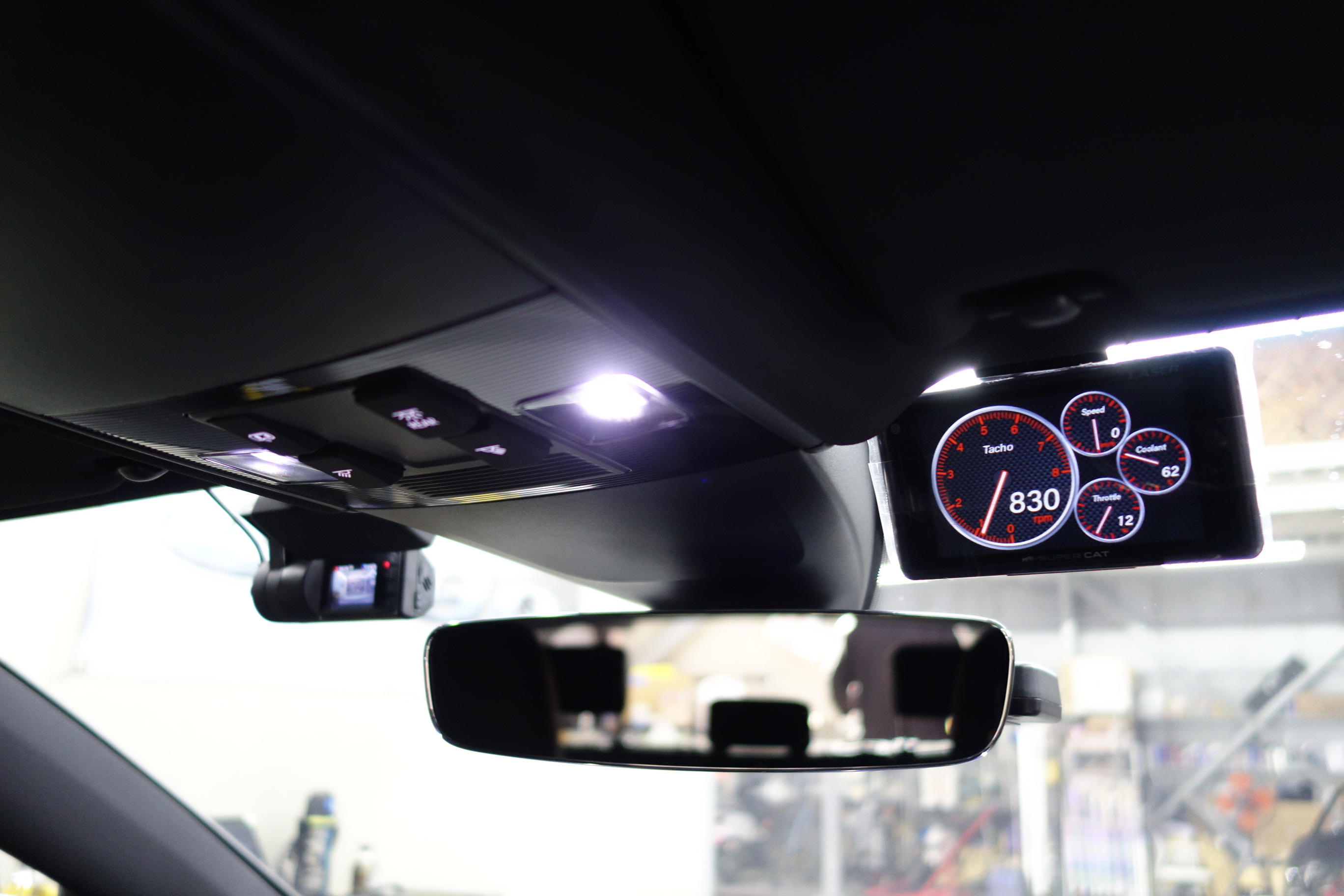あれこれつけるとダッシュ周りがゴチゃつきがちですが、このようにルームミラー周りに取付けられる製品選びをすると、ダッシュボード上は非常にスッキリとした状態で様々な機能が追加できます。