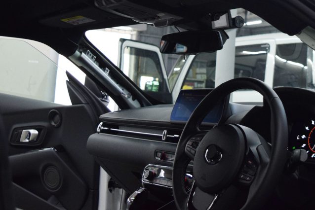 ここ数年の車には安全装置が付いているので、ルームミラーの前に大きなカバーが付いており、ドライブレコーダーやレーダー探知機を取付けるにもフロントガラス上部のカバーを避けて、何かしらを貼り付けてある車両が多く占めています。それらは全て安全に走行する上で必須部品なのですが、なるべく目立たない取付をしたいというユーザーが多いのではないかと思います。今このブログをご覧いただいている方はそんな思いでご覧いただいているのではないでしょうか。パネルに加工インストールでも良いのですが、昨今レーダーをそこまでして付ける方も少数派で。となると小さいモニターを天吊りインストールするのが見た目もお財布にもスマートというわけです。