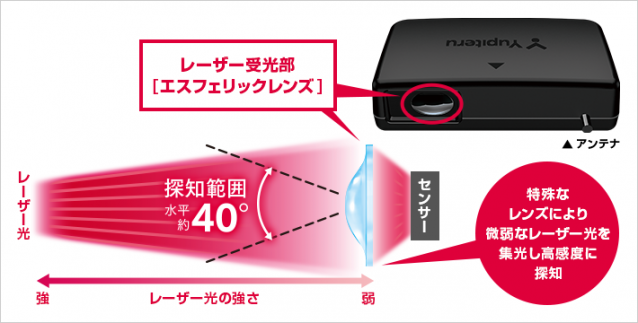 特殊なレンズにより微弱なレーザー光を集光し高感度に探知することができます。探知範囲は水平約40度です。