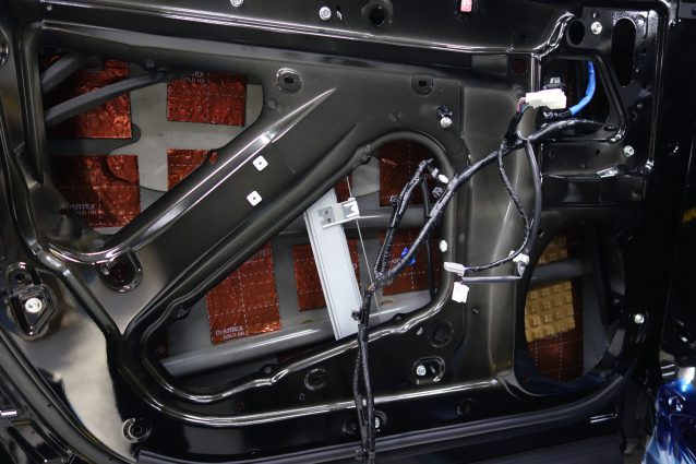 樹脂パネルをはめ込み上からカバーリングする形でドアパネルと一体にすることで、ドアをエンクロージャー化+制振加工します。