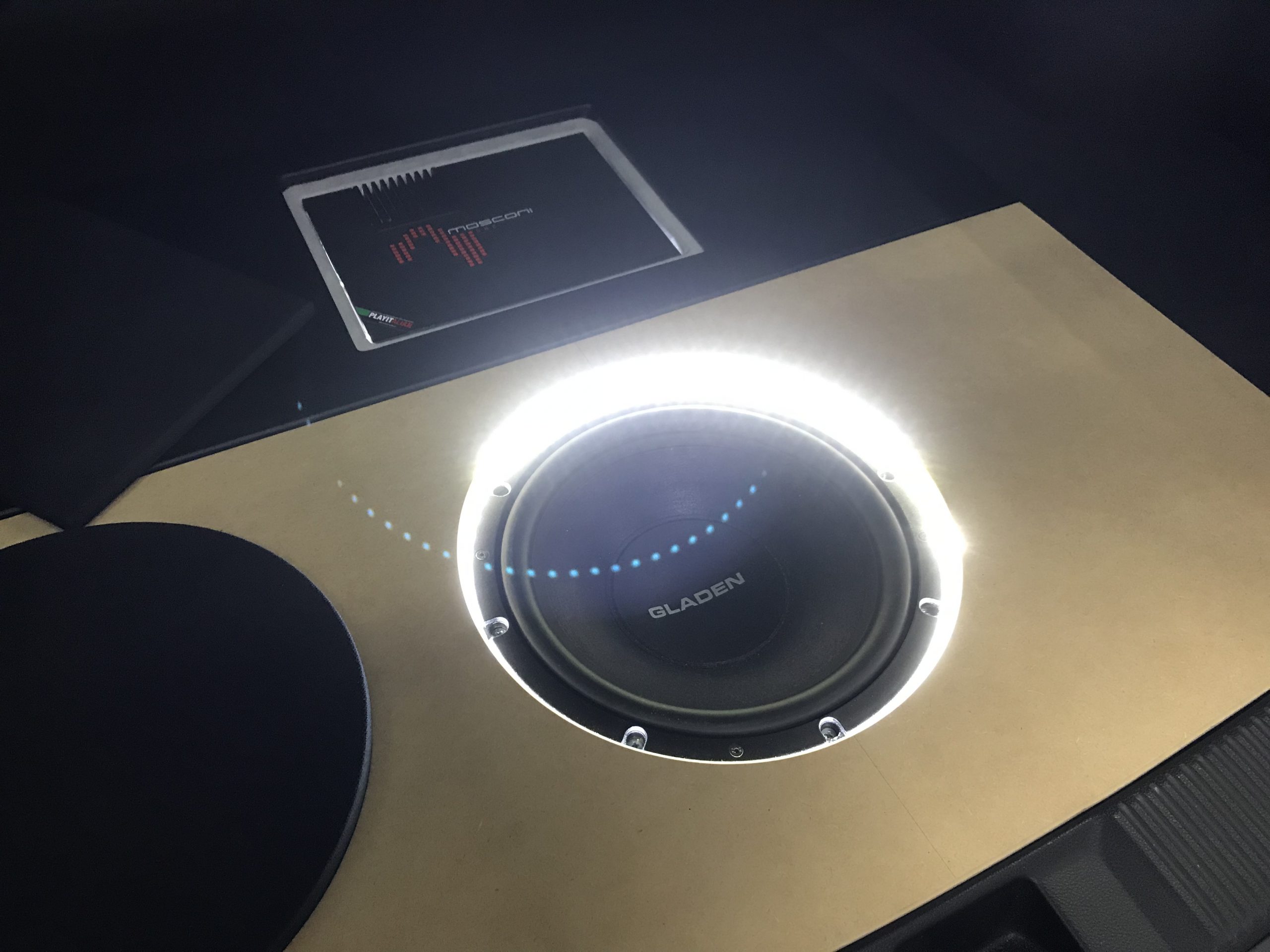 約1年間は、ブルームーンオーディオのみでドライブを楽しんでましたが、低音が足りないと思いサブウーファーのインストールを決めました。電装スタッフとの相談でmosconi(モスコニ)1チャンネルアンプ、GLADEN(グラデン)サブウーファーのインストールすることに、リアハッチには荷物を乗せる事があるので、剝き出しにしないでと依頼。後は電装スタッフにお任せで作業を進めてもらいました。