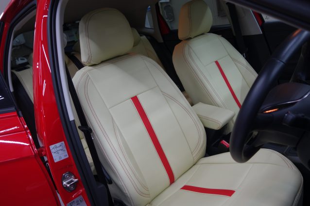 深紅のボディカラーのVW・ポロにプレミアムシートカバーブランドDotty(ダティ)のシートカバーでインテリアのイメージチェンジを行いました。