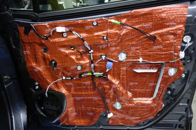 ドアデッドニングは前車同様にメンテナンスリッドを取り外しできるように施工し、全面貼りにて制振効果を高めました。