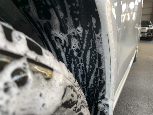 ボディは洗車による傷を防ぐために、高圧にてしっかりと汚れを落としてから専用のスポンジを使用して洗います。