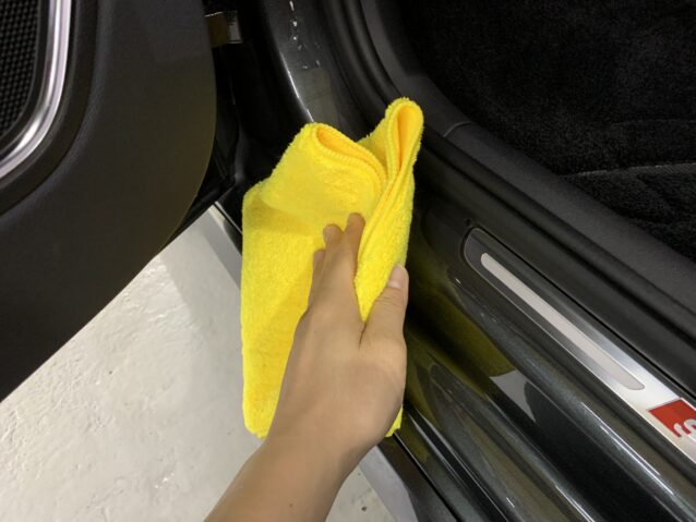 ボディへの傷を防ぐために専用の大判ウエスを使用して拭き上げます。