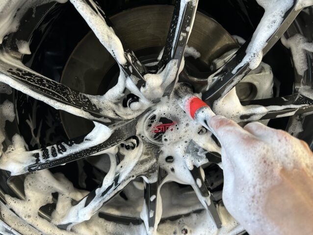 ホイールは表の見えている部分だけではなく、インナー側はブラシを、キャリパーやナット周りなどスポンジが当たりにくい箇所には筆ブラシ等を駆使し、できる限り汚れを取り除いていきます。