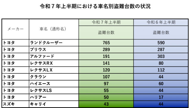 前回は県別の車両盗難件数についてご紹介しました。今回は公開されている今年度の上半期の車種別盗難件数についてもお伝えします。