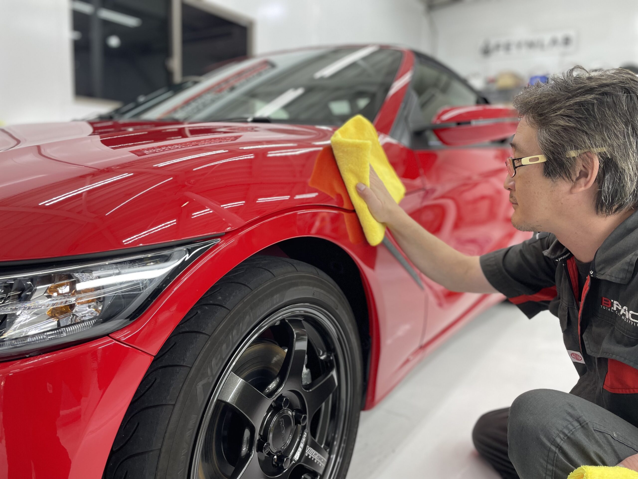 少しの温度や湿度の差でコーティングの仕上がりに影響が出てしまいます。拭き上げも専用のマイクロファイバークロスを使いムラなく拭き上げます。