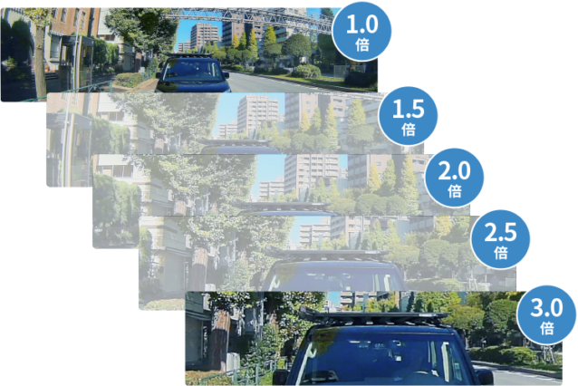 「小さく見えるのが違和感がある」と言った方もいると思いますので、通常のミラーと同じ距離感となる3倍までズームを対応しています。