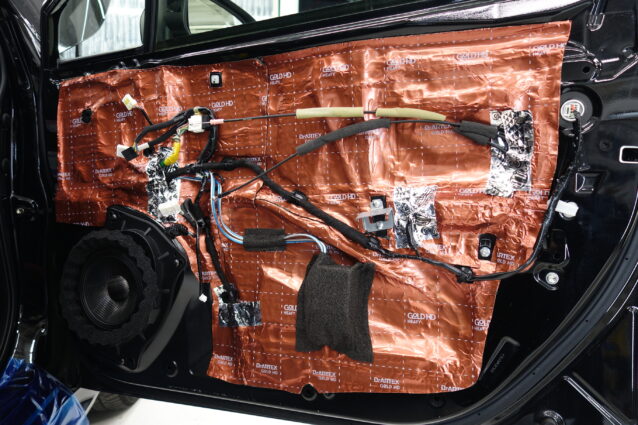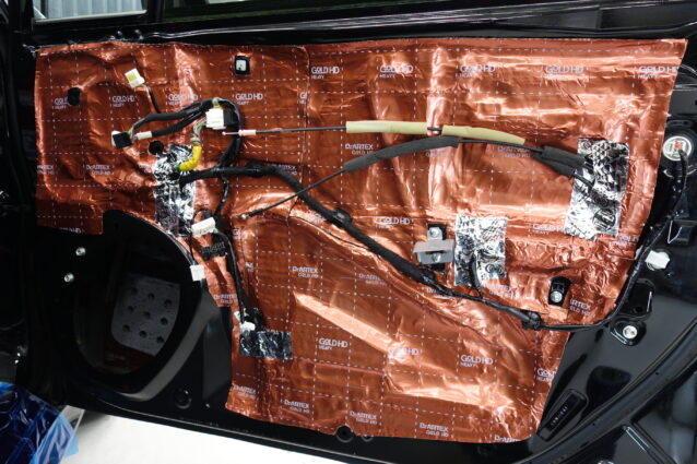 ブチルゴムとアルミシートで構成される制振材を貼り込み、施工前は振動に弱く響きやすかったドアをガッチリと固めていきます。