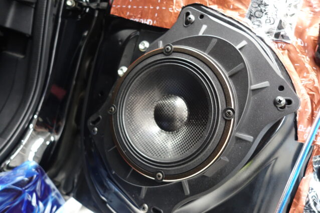 スピーカー周りにはトリム取付後にスピーカー外周に生まれる隙間から、トリム内への音の回り込みを防ぐ低反発ウレタンを貼り込み、スピーカグリルへダイレクトに音抜けするような処理を施します。