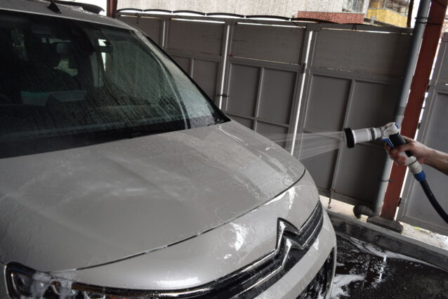 洗車の汚れとシャンプーを大まかに洗い流します。