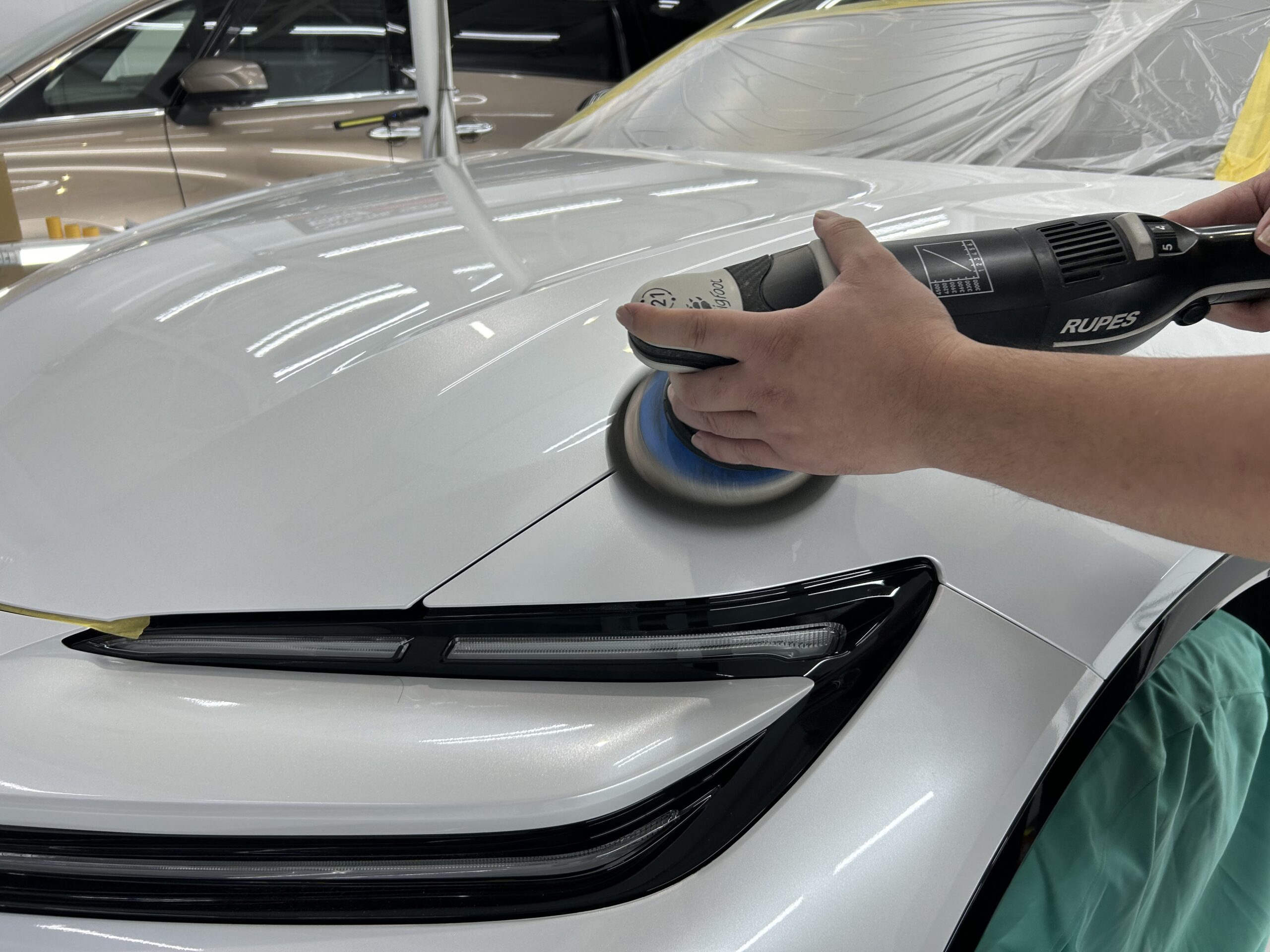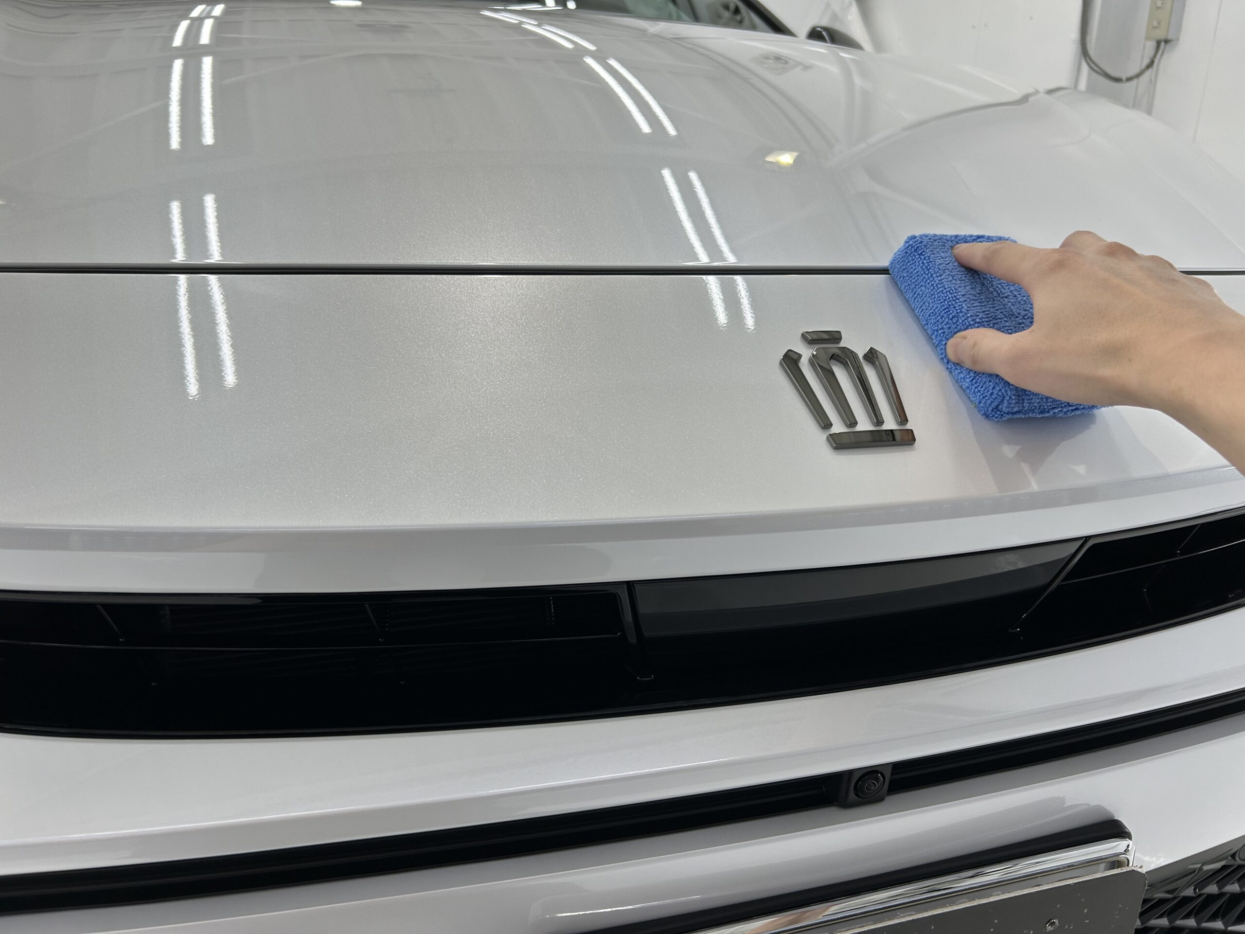 磨き作業と同じくコーティング剤の塗り込み、拭き上げも専用の照明器具を使用しながらの作業となり、こちらも高い技術と知識が必要な作業となります。