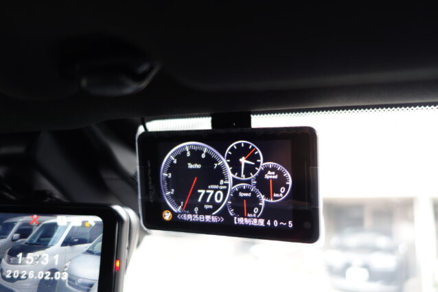 左にフロントカメラ、デジタルインナーミラー、レーザー探知機とフロントガラス上部に機器を集めることでダッシュボードには何も設置しない、スマートクリーンなインテリアになります。