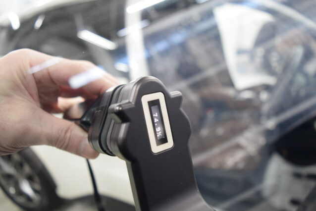 ・わずかな低下が命取り:高性能な透明遮熱フィルムを貼っても、数%下がります。施工後の数値上「70%」ギリギリになるケースが多いです。ここがポイントで、見た目は透明でも、可視光線透過率測定器で測定したら、「アウトかもしれない」というグレーゾーンなイメージが「フロントにフィルムを貼るにはリスクがある=悪」という認識を加速させています。