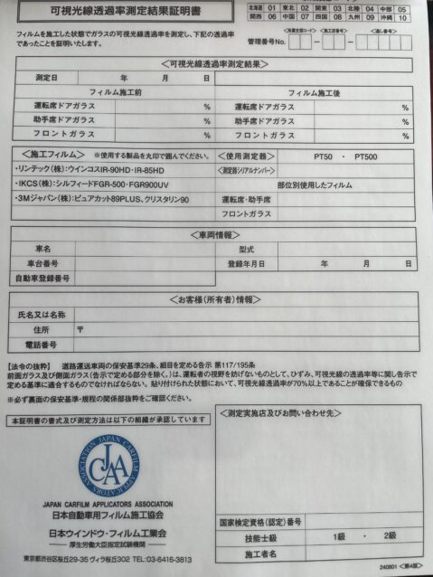 1.フィルムをフロントに貼る場合は必ず「可視光線透過率証明書」発行できかを信頼できるお店や専門店に必ず確認してください。