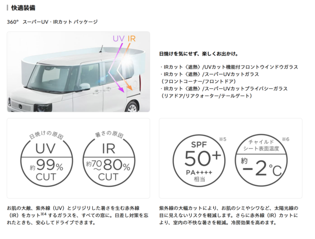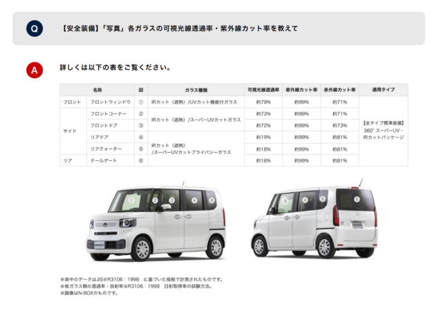 一例としてN-BOXを挙げますと、上記画像のように全面にIRカットが施されています。